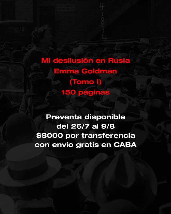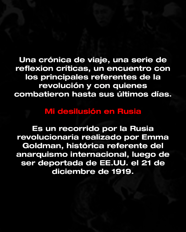 Una crónica de viaje, una serie de reflexion críticas, un encuentro con los principales referentes de la revolución y con quienes combatieron hasta sus últimos días. Mi desilusión en Rusia es un recorrido por la Rusia revolucionaria realizado por Emma Goldman, histórica referente del anarquismo internacional, luego de ser deportada de EE.UU. el 21 de diciembre de 1919.