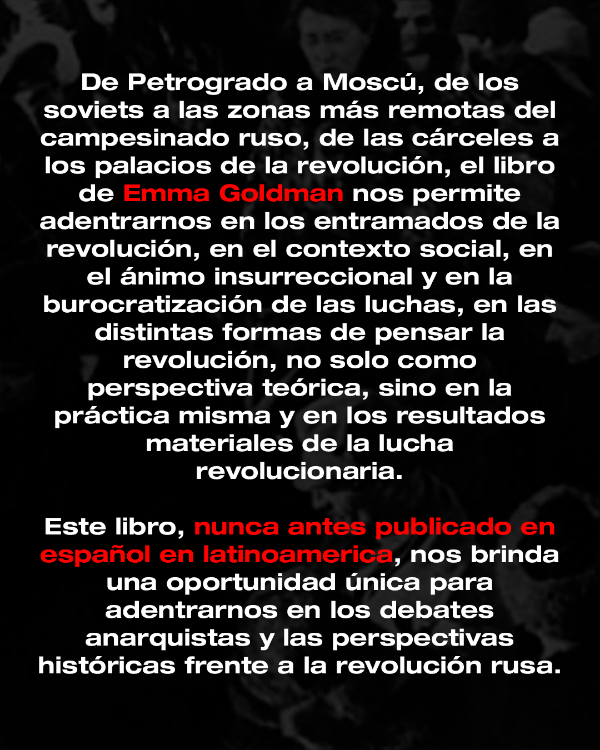 De Petrogrado a Moscú, de los soviets a las zonas más remotas del campesinado ruso, de las cárceles a los palacios de la revolución, el libro de Emma Goldman nos permite adentrarnos en los entramados de la revolución, en el contexto social, en el ánimo insurreccional y en la burocratización de las luchas, en las distintas formas de pensar la revolución, no solo como perspectiva teórica, sino en la práctica misma y en los resultados materiales de la lucha revolucionaria.