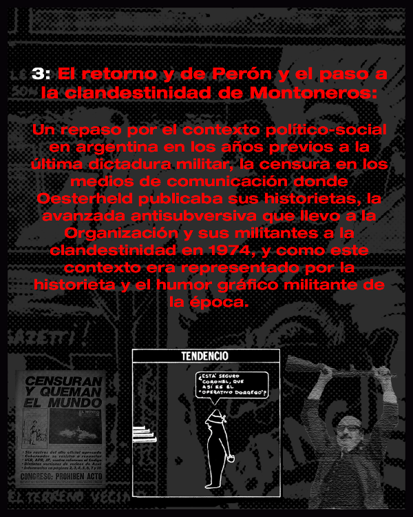 3: El retorno de Perón y el paso a la clandestinidad de Montoneros: un repaso gráfico y ensayístico por el contexto político-social en los años previos a la última dictadura cívico-militar, la militancia y el rol de la historieta en la subversión durante la época.