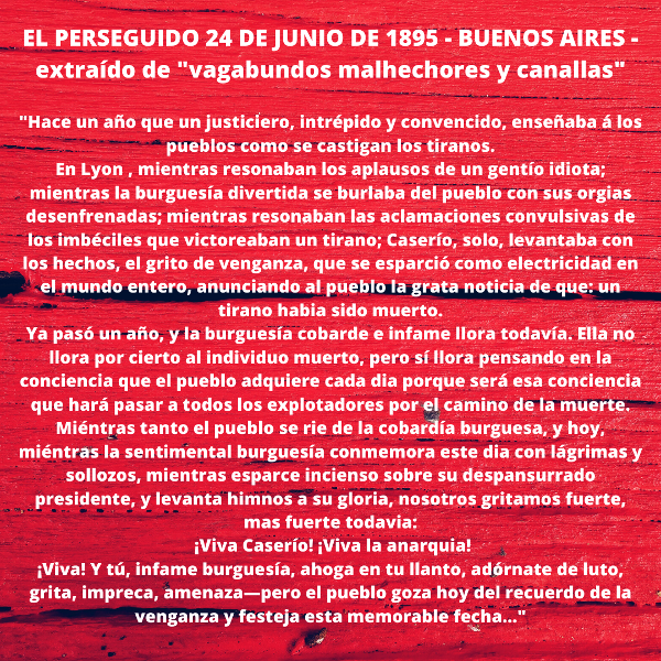 Un recorrido por los comienzos del anarquismo antiorganización en buenos aires de la mano del periódico "El Perseguido" en una serie de reflexiones y debates sobre grupos de afinidad, violencia anarquista, libertad individual/colectiva, comunismo y colectivismo anárquico, al mismo tiempo que nos adentramos en la mirada sobre buenos aires a fines del siglo xix en los ojos y la experiencia de compañerxs que supieron atravesar distintos desafíos y llegar a una tirada de 10.000 ejemplares a lo largo de sus 7 años de actividad.
